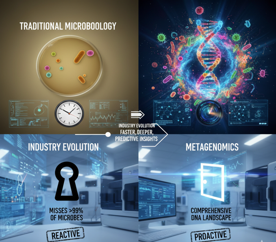 Traditional food microbiology is reactive and target-specific—organisms not included in the test panel remain invisible. Metagenomics replaces this limitation with total microbial surveillance.